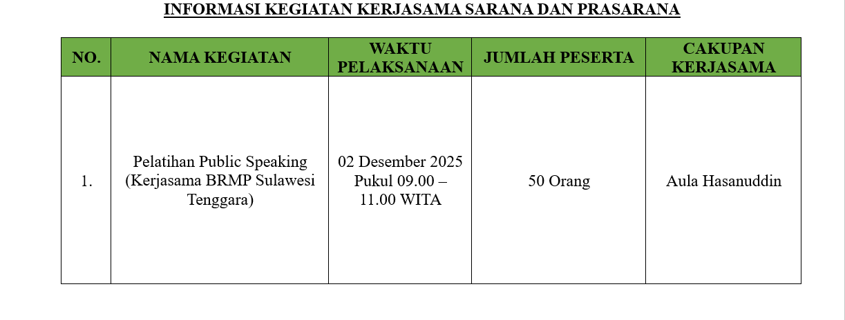 Informasi Kegiatan Kerjasama Tanggal 02 Desember 2025 posted by Haryuti Abdi 32 02/12/2025 09:00:00 Informasi Kegiatan Kerjasama Sarana dan Prasarana di BBPP Batangkaluku