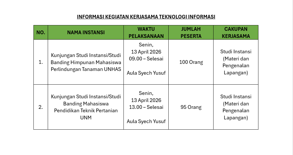 Kegiatan Kerjasama Tanggal 13 April 2026 posted by Haryuti Abdi 6 13/04/2026 08:00:00 Informasi Kegiatan Kerjasama Teknologi Informasi di BBPP Batangkaluku