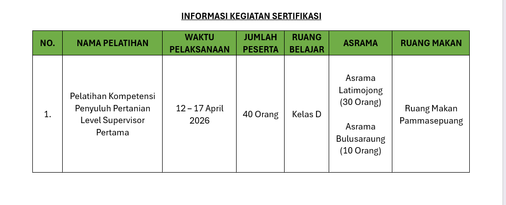 Kegiatan Sertifikasi Tanggal 12 - 17 April 2026 posted by Haryuti Abdi 5 12/04/2026 08:00:00 Informasi Kegiatan Sertifikasi di BBPP Batangkaluku